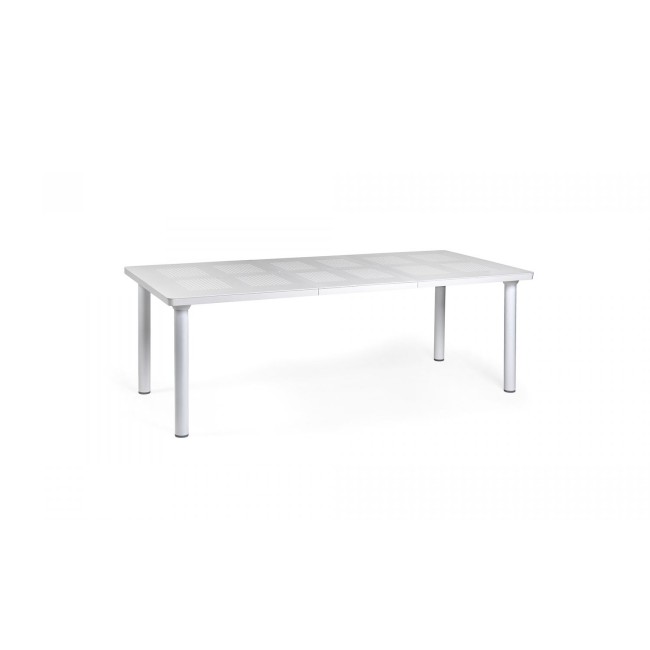 Extendable outdoor table in polypropylene; the design evokes traditional wrought iron furniture. The top is decorated with a repeating pattern of small perforations. Round section legs, affixed to the top with a simple screw system.
